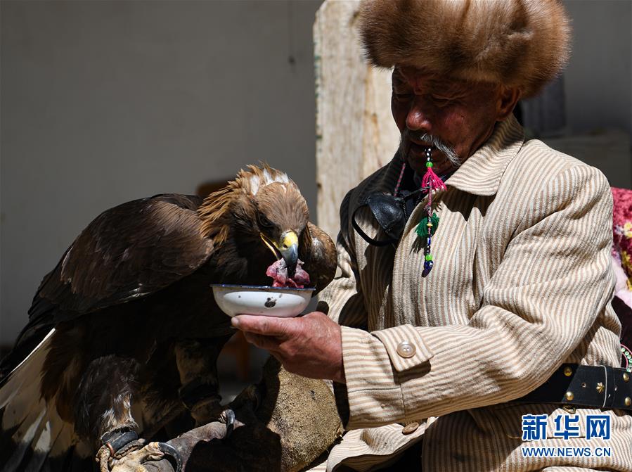 6月29日,库尔马西·胡特曼在家中给猎鹰喂食鲜羊肉。新华社记者宋彦桦摄