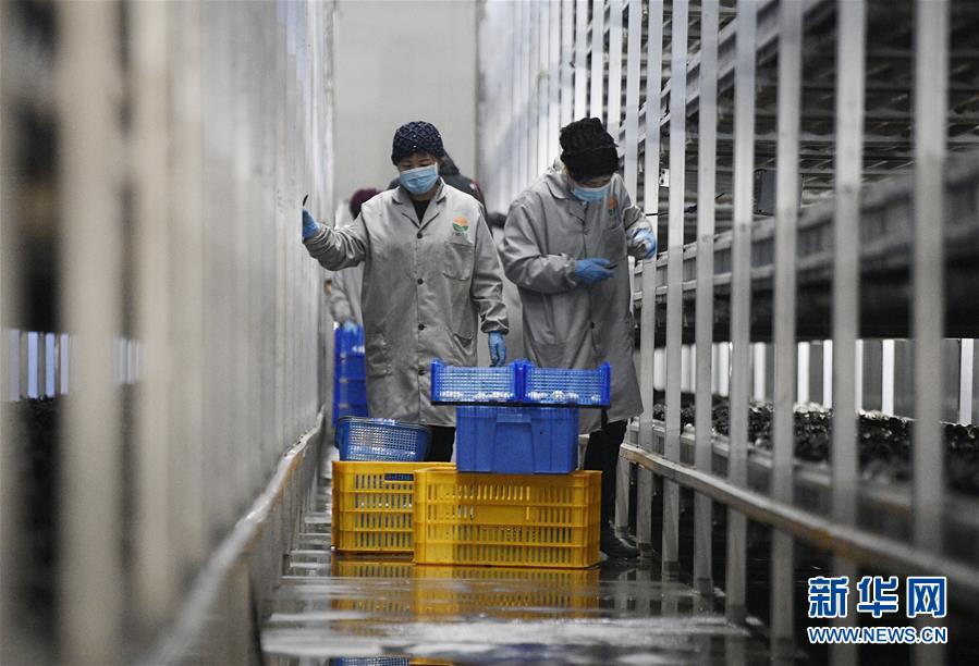 2020年3月18日,在宁夏银川市永宁县闽宁镇双孢菇栽培示范基地,农民在采摘蘑菇。新华社记者王鹏摄