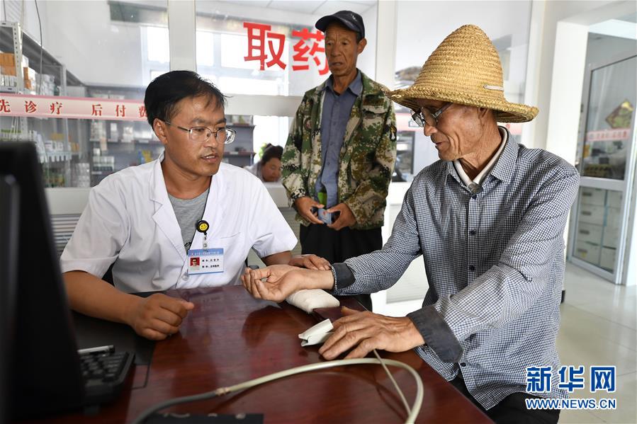 宁夏银川市永宁县闽宁镇原隆村卫生室,罗校必(右一)在看病(2019年9月3日摄)。新华社记者王鹏摄