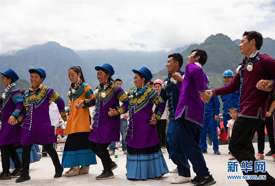 6月29日,阿布洛哈村村民身着彝族传统服饰载歌载舞庆祝通村公路通车。新华社记者江宏景摄