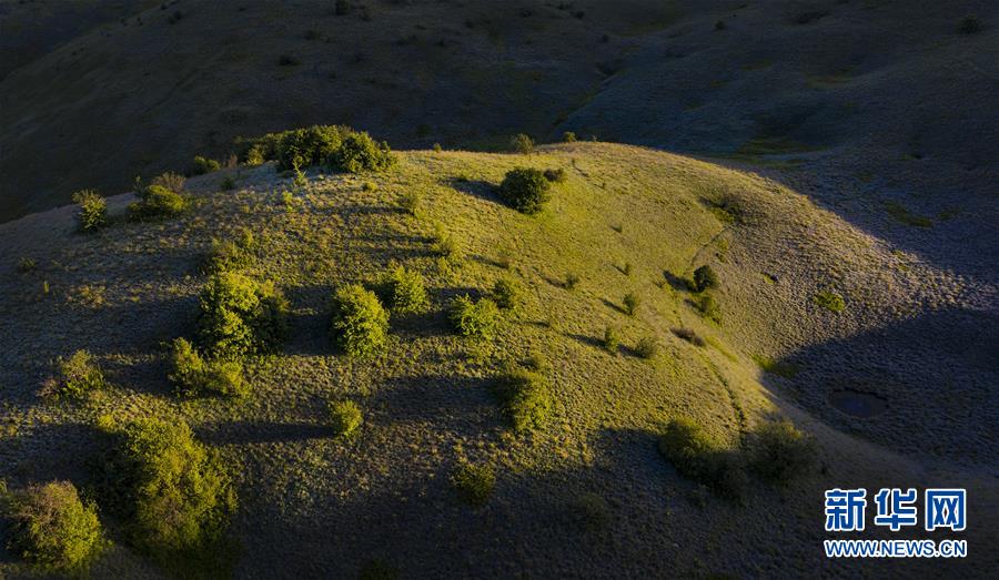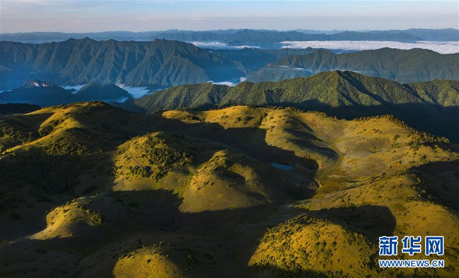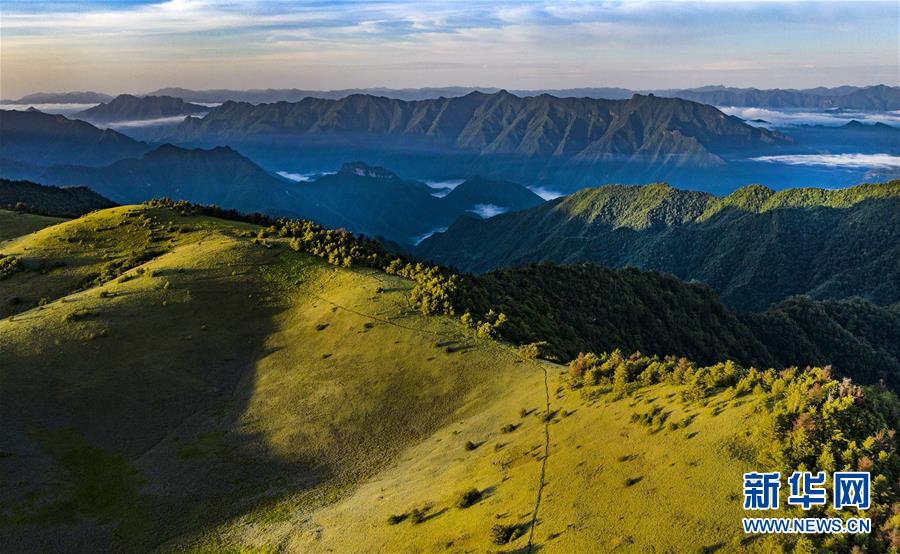 6月30日,晨曦中的神田草甸(无人机照片)。位于陕西省安康市岚皋县与重庆市城口县交界处大巴山神田主脊北坡的神田草甸,面积超过1.1万亩。夏日的朝霞中,起伏的草甸仿佛一块宽大无边的绿色地毯,镶嵌在大巴山上,如诗如画。新华社记者陶明摄