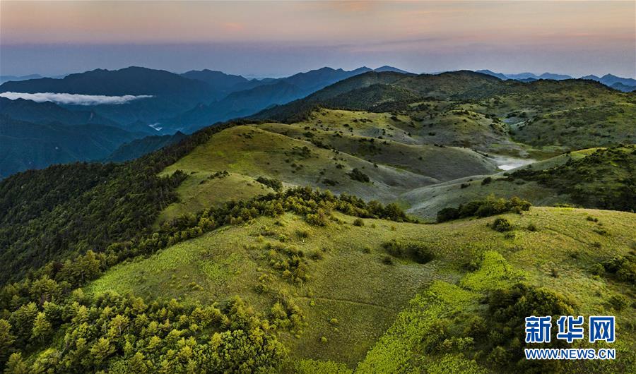 6月30日,晨曦中的神田草甸(无人机照片)。位于陕西省安康市岚皋县与重庆市城口县交界处大巴山神田主脊北坡的神田草甸,面积超过1.1万亩。夏日的朝霞中,起伏的草甸仿佛一块宽大无边的绿色地毯,镶嵌在大巴山上,如诗如画。新华社记者陶明摄