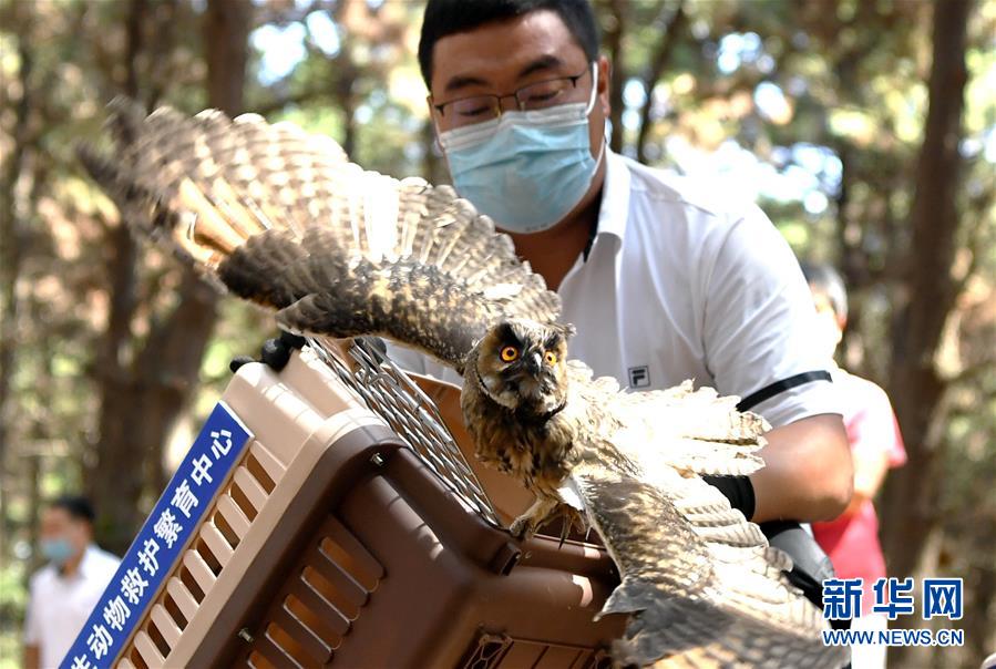 7月1日,吉林省野生动物救护繁育中心工作人员放飞一只长耳鸮。当日,吉林省东北虎园举行放飞活动,吉林省野生动物救护繁育中心救护的40只珍稀野生鸟类成功放归自然。新华社记者林宏摄