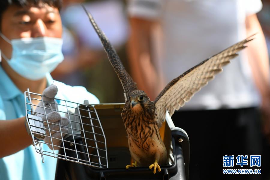 7月1日,在吉林省东北虎园,工作人员放飞一只红隼。新华社记者林宏摄
