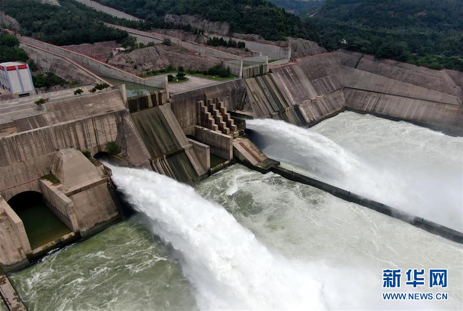 这是7月1日拍摄的黄河小浪底洪水调度运用、水库泄洪的场景(无人机照片)。为进一步打开下游防洪调度空间,提高防洪调度和应急处置水平,水利部黄河水利委员会于6月24日正式启动2020年防御大洪水实战演练,6月28日8时起,黄河小浪底水库按照5500立方米每秒流量下泄,达到本次实战演练最大流量。目前,黄河下游大流量过程正在演进,下游河势总体稳定。新华社记者朱祥摄