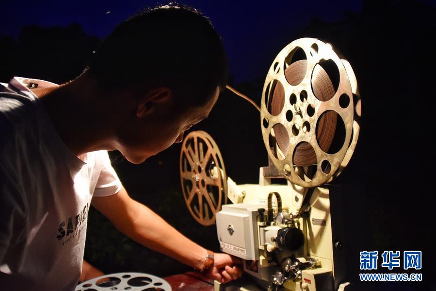 6月30日晚,电影放映中,朱强在更换胶片。新华社记者郑梦雨摄