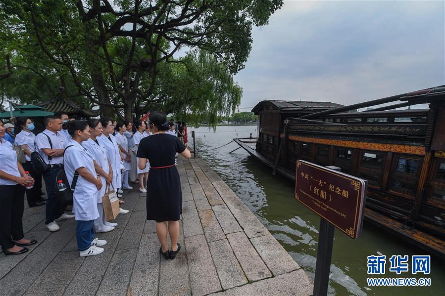 7月1日,嘉兴市新冠肺炎疫情抗疫一线党员在南湖景区的中共一大纪念船边参加“七一”活动。新华社记者徐昱摄