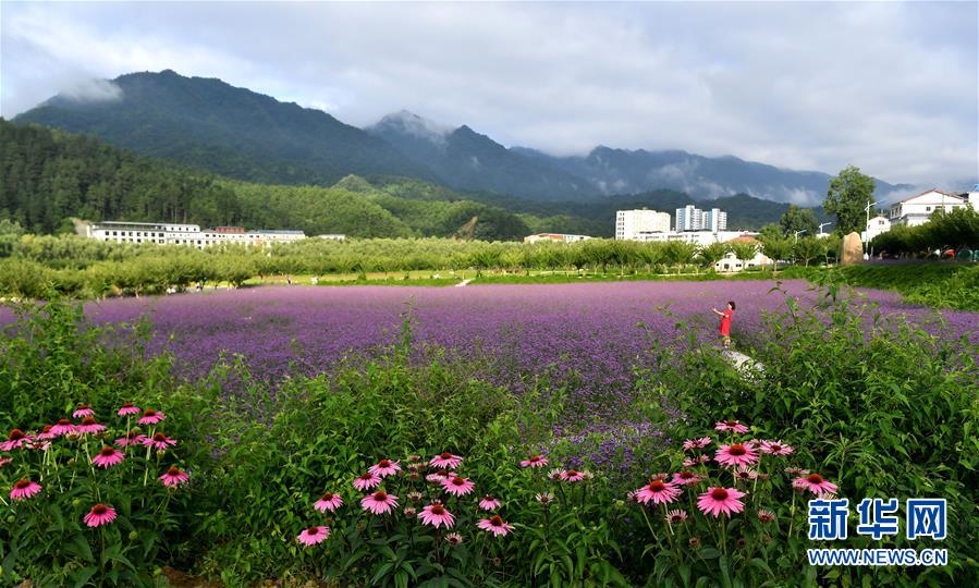7月2日,市民在位于留坝县城的金水湾花海拍照。近日,陕西省汉中市留坝县金水湾花海的各类鲜花次第绽放,绚丽缤纷。新华社记者刘潇摄