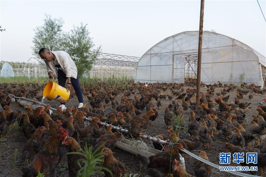 7月1日,在位于黑龙江省五大连池市桑庆军的鸡场上,桑庆军在给鸡喂水。新华社记者谢剑飞摄
