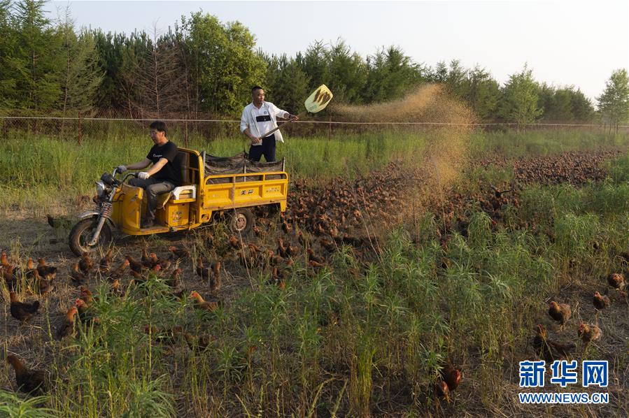 7月1日,在黑龙江省五大连池市的草原上,桑庆军在三轮车上抛撒饲料喂鸡。新华社记者谢剑飞摄