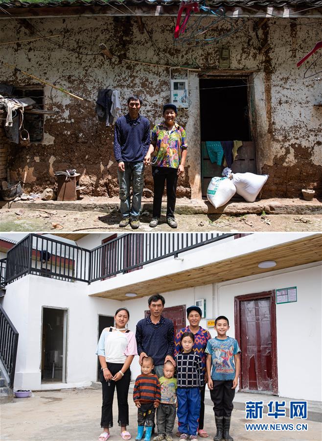 拼版图片:上图为且沙次干、阿达么日杂夫妇俩在阿布洛哈村3组老屋土坯房前留影(6月27日摄);下图为且沙次干一家人在集中安置点新居前留影(6月30日摄)。