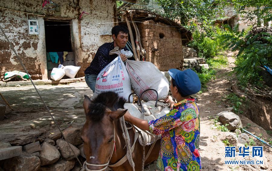 且沙次干把两袋谷物放在马背上(6月27日摄)。当日,且沙次干和妻子阿达么日杂把老房子里的粮食、家什等收拾一番,准备搬进村集中安置点的新居。新华社记者 江宏景 摄