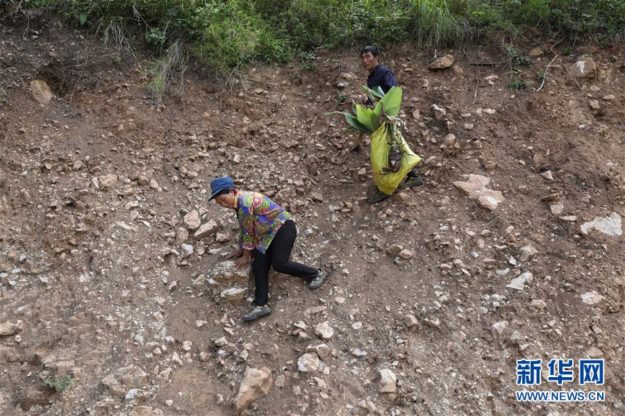 且沙次干、阿达么日杂夫妇在悬崖峭壁上挖了几株野生的地涌金莲花,准备栽种在新居门前(6月27日摄)。新华社记者 江宏景 摄