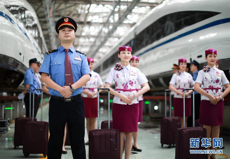 7月3日,担任首发列车值乘工作的班组人员在贵阳亮相。 新华社记者 刘续 摄
