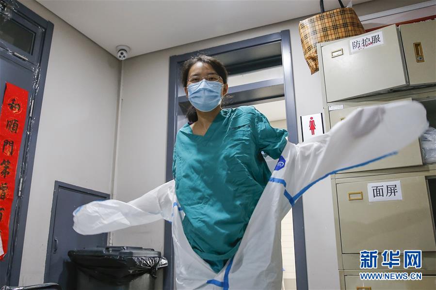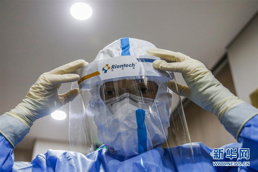 7月3日,中日友好医院检验科新冠核酸检测实验室的检验人员闫克芹在进入污染区前穿戴防护装备。新华社记者张玉薇摄
