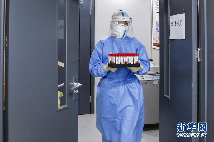 7月3日,中日友好医院检验科新冠核酸检测实验室的检验人员闫克芹运送经过灭活的样本。新华社记者张玉薇摄