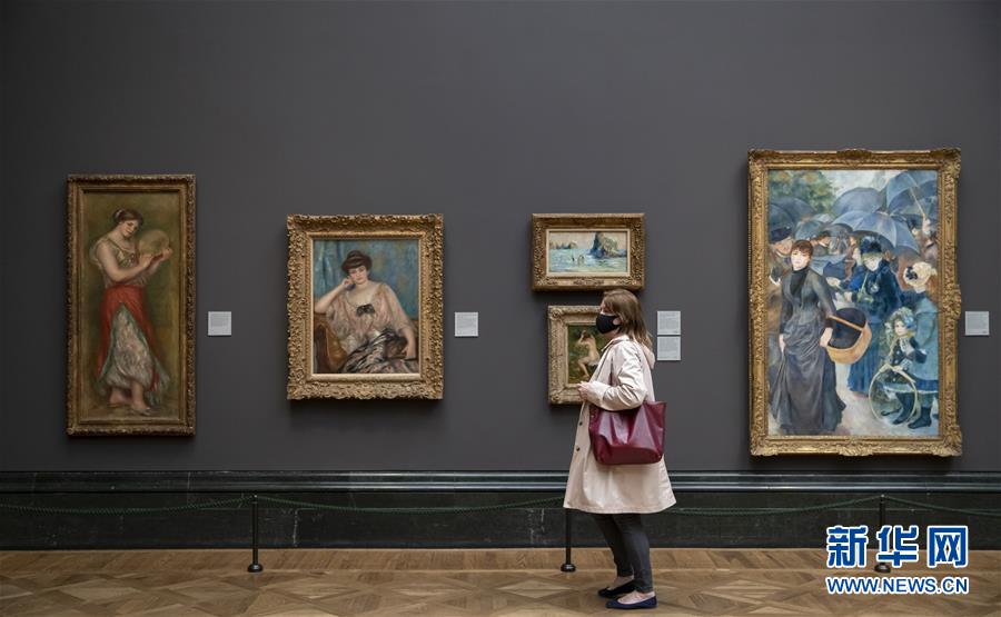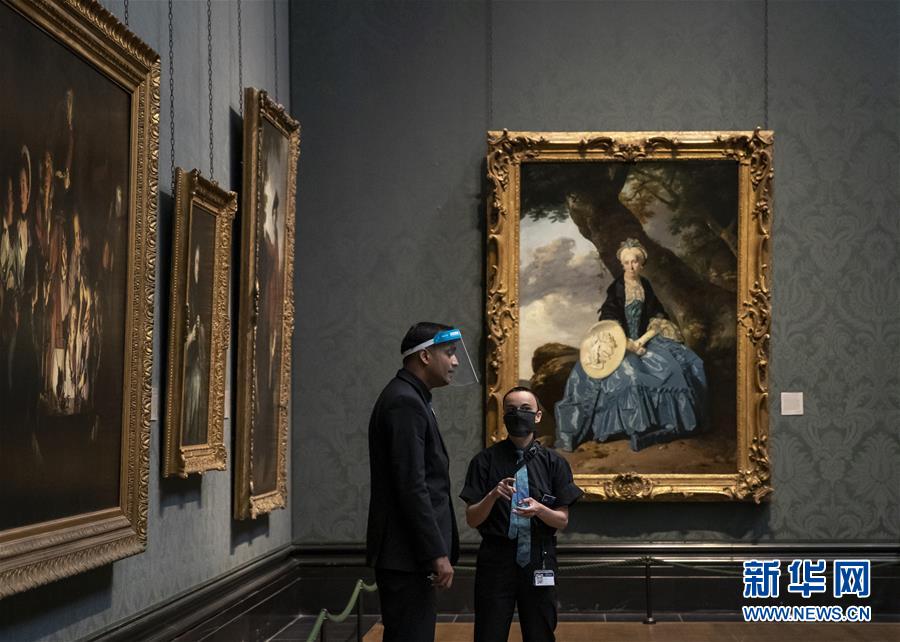 7月4日,参观者佩戴口罩在英国国家美术馆的媒体开放日上参观。新华社记者韩岩摄