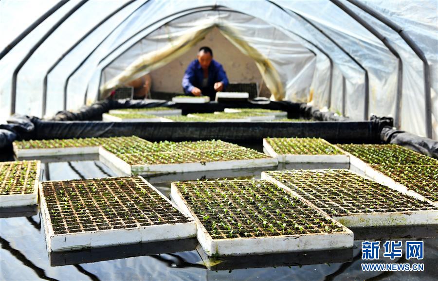 陕西太白县咀头镇塘口村的村民通过“漂浮育苗”的方式进行蔬菜育苗(7月4日摄)。新华社记者刘潇摄