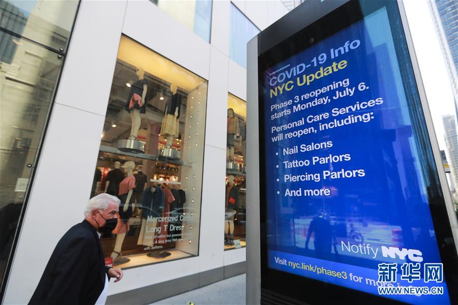 7月4日,一名行人从美国纽约第五大道显示新冠疫情最新情况的信息屏旁经过。当日是美国独立日,美国多地疫情仍面临严峻形势。美国约翰斯·霍普金斯大学实时统计数据显示,美国累计新冠确诊病例4日已超过280万例。新华社记者王迎摄