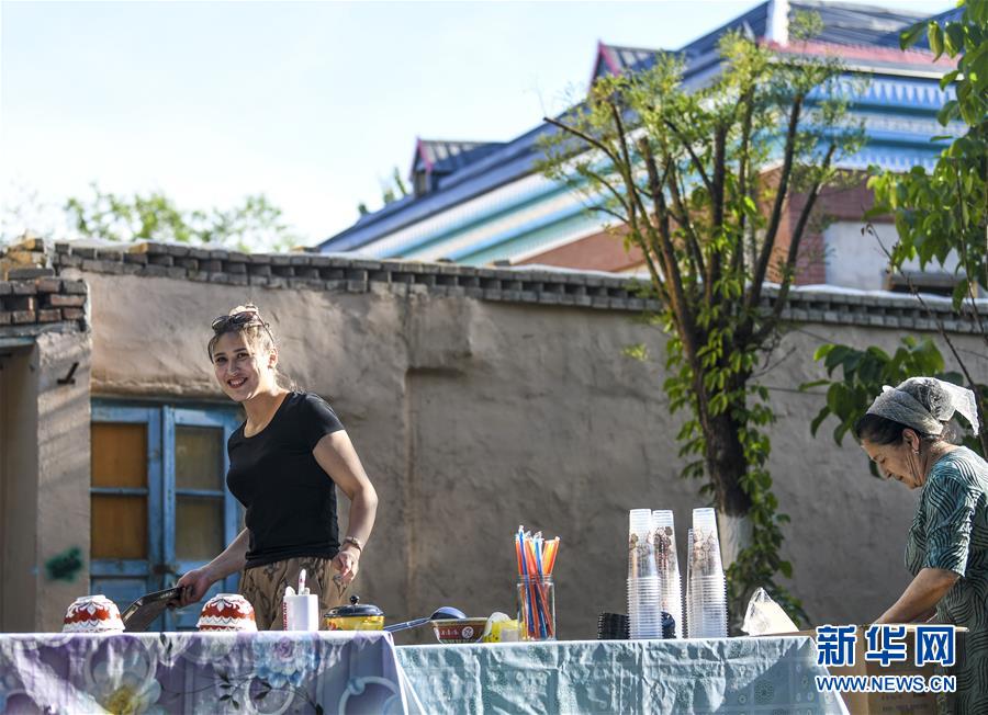7月4日,在位于六星街内的一家民居前,房主麦尔比岩·艾买提江(左)和母亲在售卖自家制作的酸奶。新华社记者王菲摄