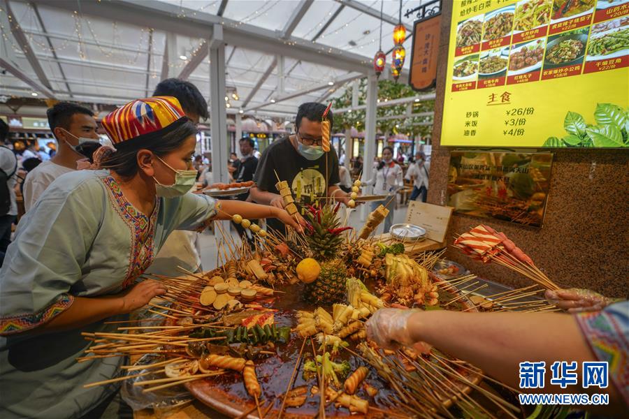 游客在乌鲁木齐大巴扎景区挑选麻辣烫(7月4日摄)。夏日周末,乌鲁木齐市大巴扎景区内熙熙攘攘,人们来到这里品尝美食、休闲购物。2018年,经过靓化改造后的大巴扎景区新增长约800米的步行街,分为文创文旅和“非遗”项目街区、国际时尚街区和大巴扎美食街区,是乌鲁木齐最受欢迎的旅游目的地之一。新华社记者赵戈摄