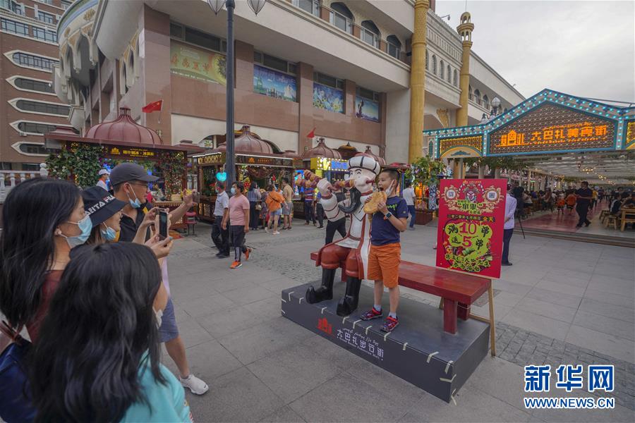 游客在乌鲁木齐大巴扎美食街前拍照留念(7月4日摄)。夏日周末,乌鲁木齐市大巴扎景区内熙熙攘攘,人们来到这里品尝美食、休闲购物。2018年,经过靓化改造后的大巴扎景区新增长约800米的步行街,分为文创文旅和“非遗”项目街区、国际时尚街区和大巴扎美食街区,是乌鲁木齐最受欢迎的旅游目的地之一。新华社记者赵戈摄