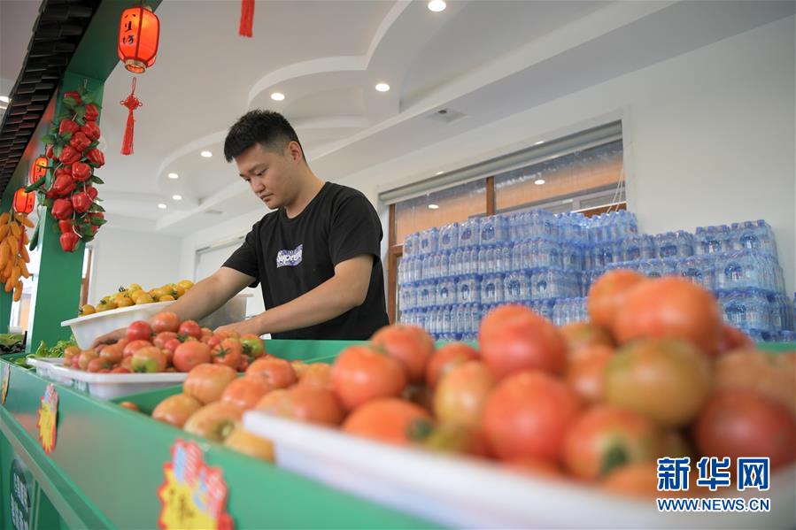 7月5日,在黑龙江省肇东市昌五镇昌盛村农业生态观光园农产品展销区,工作人员在整理果蔬。黑龙江省肇东市昌五镇昌盛村农业生态观光园占地千余亩,融合了种植采摘、民俗产品展销、旅游观光等项目,方便周边农民就近就业,助力脱贫增收。新华社记者王建威摄