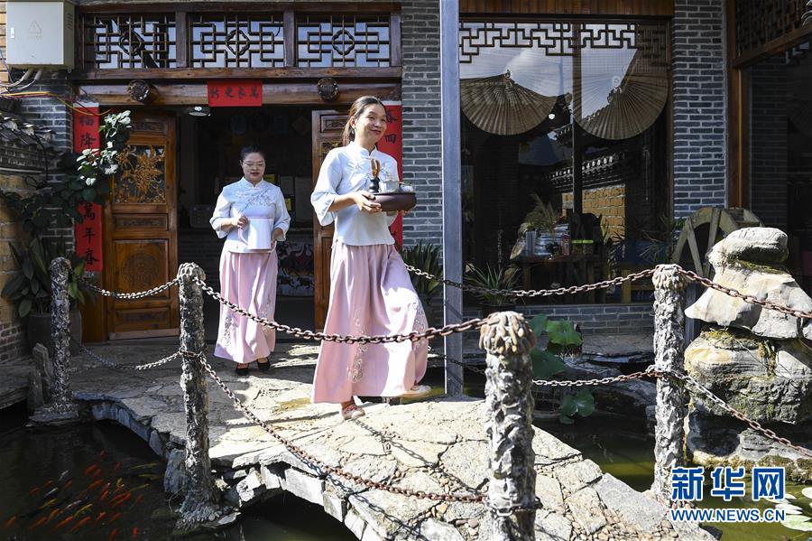 7月4日,服务员在广西阳朔一家民宿内忙碌。她们是阳朔县阳朔镇的村民。新华社记者曹祎铭摄