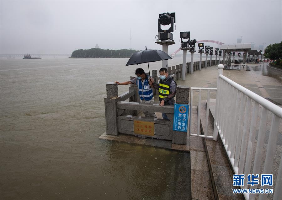 7月6日,工作人员在武汉龙王庙观察水情。记者6日从武汉市防汛抗旱指挥部办公室获悉,5日以来,武汉遭暴雨袭击,全市多处路段渍水。至6日4时,长江汉口站超设防水位1.79米,汉江新沟站超警戒水位0.01米。鉴于当前水雨汛情和渍涝情况,武汉市从6日5时起,将排涝应急响应级别提升至Ⅱ级;从6时30分起,将防汛应急响应级别提升至Ⅱ级。新华社记者肖艺九摄