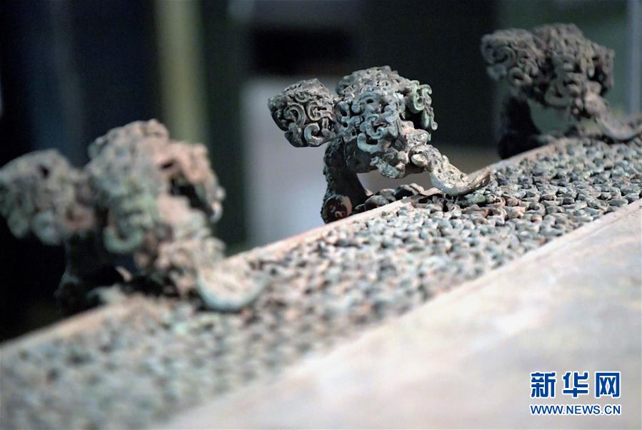 这是河南博物院展厅里云纹铜禁上的龙形附兽(2019年11月18日摄)。新华社记者李安摄