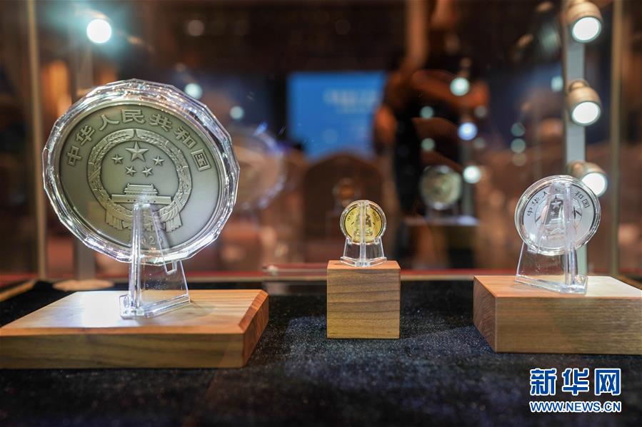 这是首发仪式现场展示的纪念币(7月6日摄)。7月6日,正值良渚古城遗址成功申报世界文化遗产一周年。中国人民银行于当天发行世界遗产(良渚古城遗址)金银纪念币一套,首发仪式在浙江良渚古城遗址公园举行。新华社记者殷晓圣摄