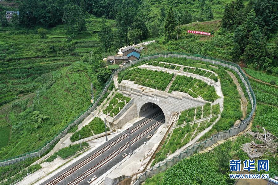 7月6日拍摄的安六铁路岩脚隧道(无人机照片)。当日,新建贵州安六铁路(安顺至六盘水)联调联试工作进入收尾阶段,开通前的各项准备工作已基本就绪。安六铁路线路全长约125公里,设计时速250公里,为国家I级双线客运专线。建成投用后,贵阳至六盘水的铁路旅行时间可从现在的3.5小时缩短为1小时左右,贵州省六盘水市将全面接入全国高铁网。新华社记者刘续摄