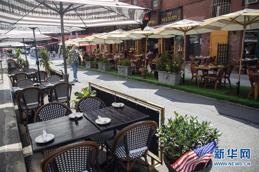 7月6日,一名男子从美国纽约一家餐厅的户外餐区旁经过。当天,纽约进入重启第三阶段,美甲店、按摩店等个人护理业在经历近4个月的停业后被允许重新开放。因防疫需要,原本应在第三阶段开放的餐饮业室内就餐仍处于暂停状态。新华社记者王迎摄