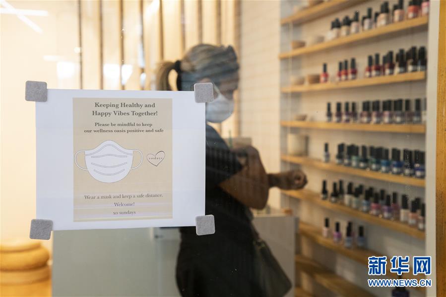 7月6日,顾客在美国纽约一家美甲店挑选指甲油,店门上贴着佩戴口罩进店的提示。当天,纽约进入重启第三阶段,美甲店、按摩店等个人护理业在经历近4个月的停业后被允许重新开放。因防疫需要,原本应在第三阶段开放的餐饮业室内就餐仍处于暂停状态。新华社记者王迎摄