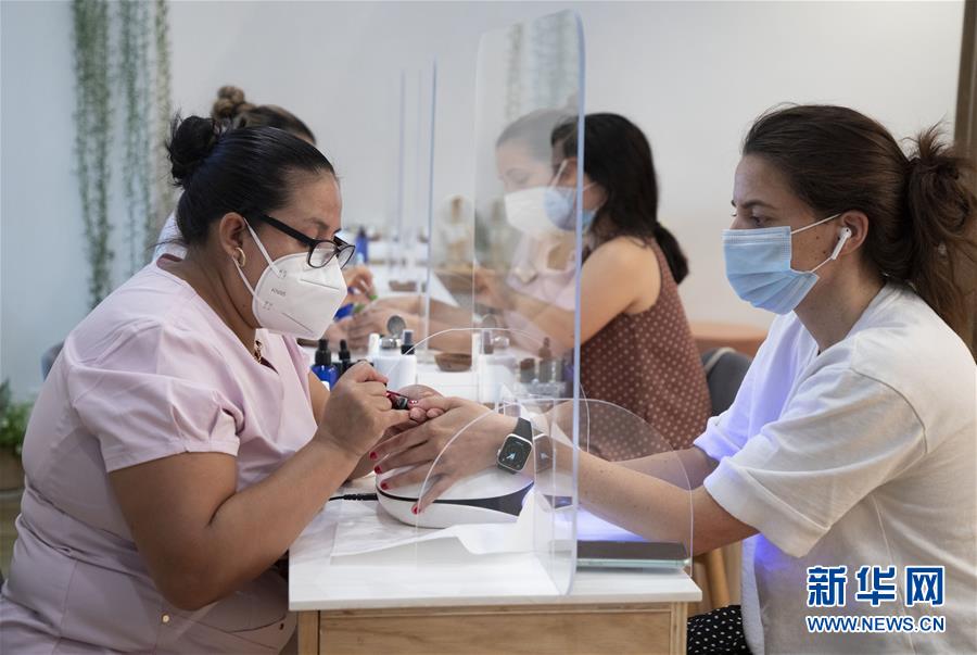 7月6日,技师在美国纽约一家美甲店为顾客美甲。当天,纽约进入重启第三阶段,美甲店、按摩店等个人护理业在经历近4个月的停业后被允许重新开放。因防疫需要,原本应在第三阶段开放的餐饮业室内就餐仍处于暂停状态。新华社记者王迎摄
