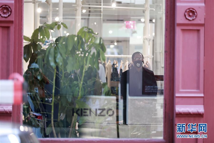 7月6日,佩戴口罩的行人走过美国纽约的一家糖果店。新华社记者王迎摄