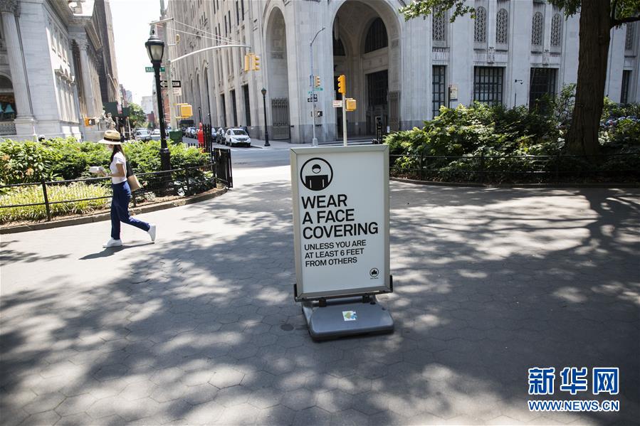 7月6日,行人走过美国纽约一处提醒人们佩戴口罩的标牌。新华社记者王迎摄