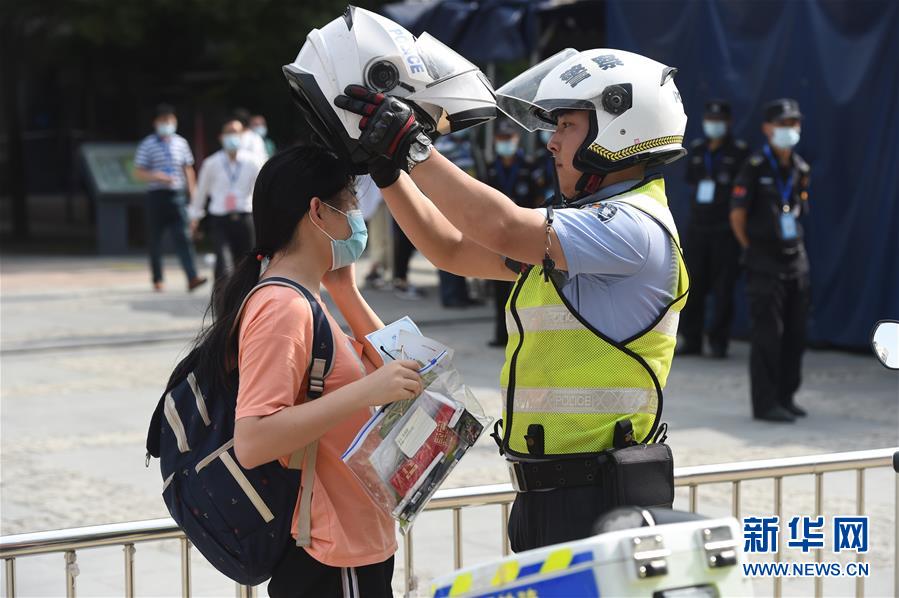 7月7日,在安徽省合肥市五十中学天鹅湖校区考点,交警将快要迟到的考生送到考场。当日,2020年高考拉开帷幕。新华社记者周牧摄