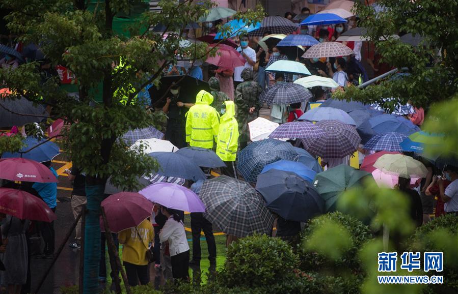 7月7日,在湖北省武汉市东湖中学考点外,民警在雨中执勤。当日,2020年高考拉开帷幕。新华社记者肖艺九摄