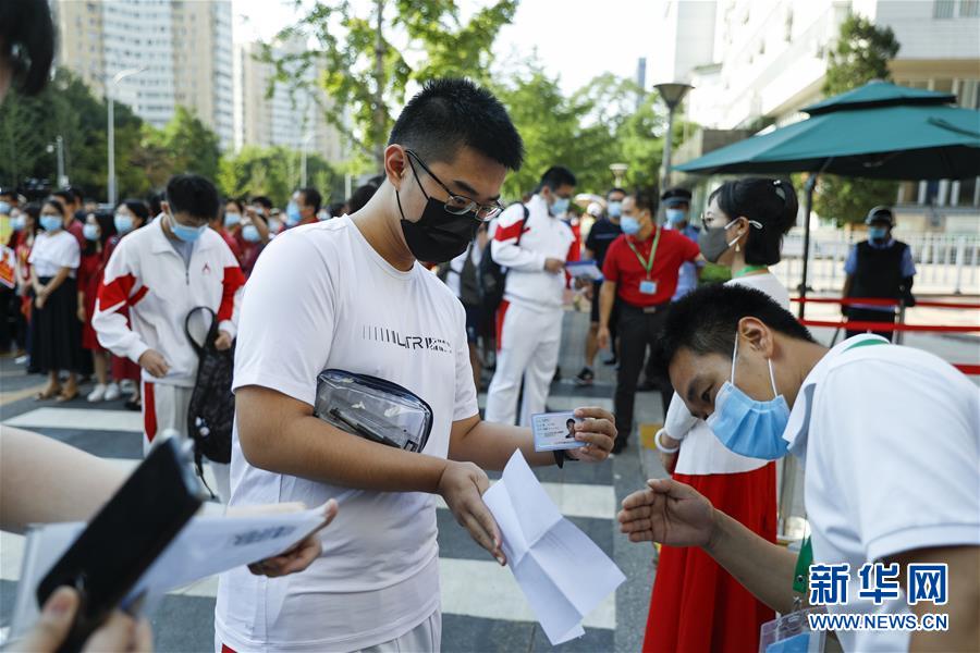 7月7日,在位于北京的中国人民大学附属中学考点外,工作人员查验考生准考证和身份证等证件信息。当日,2020年高考拉开帷幕。新华社记者沈伯韩摄