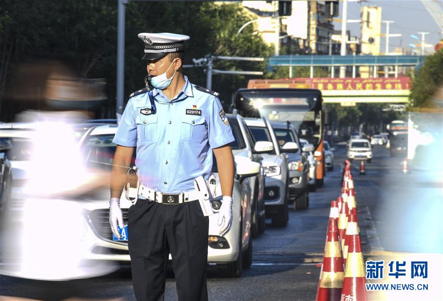 7月7日,在乌鲁木齐市第六十八中学考点外,乌鲁木齐市公安局交通警察支队新市区大队阿勒泰路中队中队长谢建明在引导考生通过马路。当日,2020年高考拉开帷幕。新华社记者王菲摄