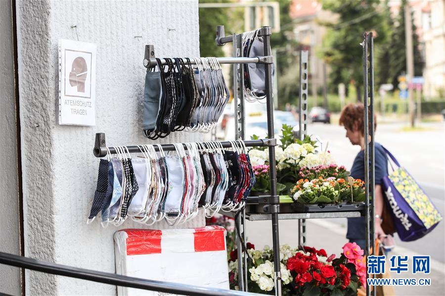 这是7月7日在德国首都柏林拍摄的一家店铺在待售口罩旁悬挂着提示顾客佩戴口罩的告示。针对有地方官员呼吁取消民众乘坐公交车和在商场购物时须戴口罩的规定,德国联邦政府6日表示,支持延续“口罩强制令”。4月底,德国全部16个联邦州陆续出台“口罩强制令”,即居民在乘坐公交车和购物时须佩戴口罩。新华社记者单宇琦摄