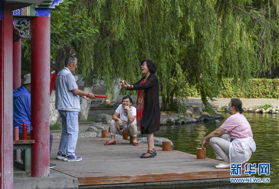 在乌鲁木齐人民公园的一处角落里,戏迷们在练唱(7月5日摄)。新华社记者赵戈摄