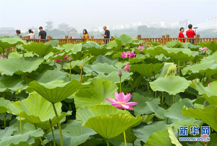 7月7日,游客在唐山市南湖公园欣赏盛开的荷花。近日,河北省唐山市南湖公园内荷花竞相绽放,呈现出“接天莲叶无穷碧,映日荷花别样红”的美丽景象,吸引了众多游客前来观赏。新华社记者杨世尧摄