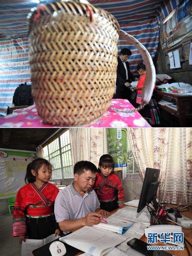 这是一张拼版照片,上图:在广西龙胜龙脊镇江柳村翁江小学,余启贵老师在给学生上课(2013年2月26日摄);下图:在广西龙胜龙脊镇江柳村翁江小学,余启贵老师在给学生上课(7月7日摄)。新华社记者陆波岸摄