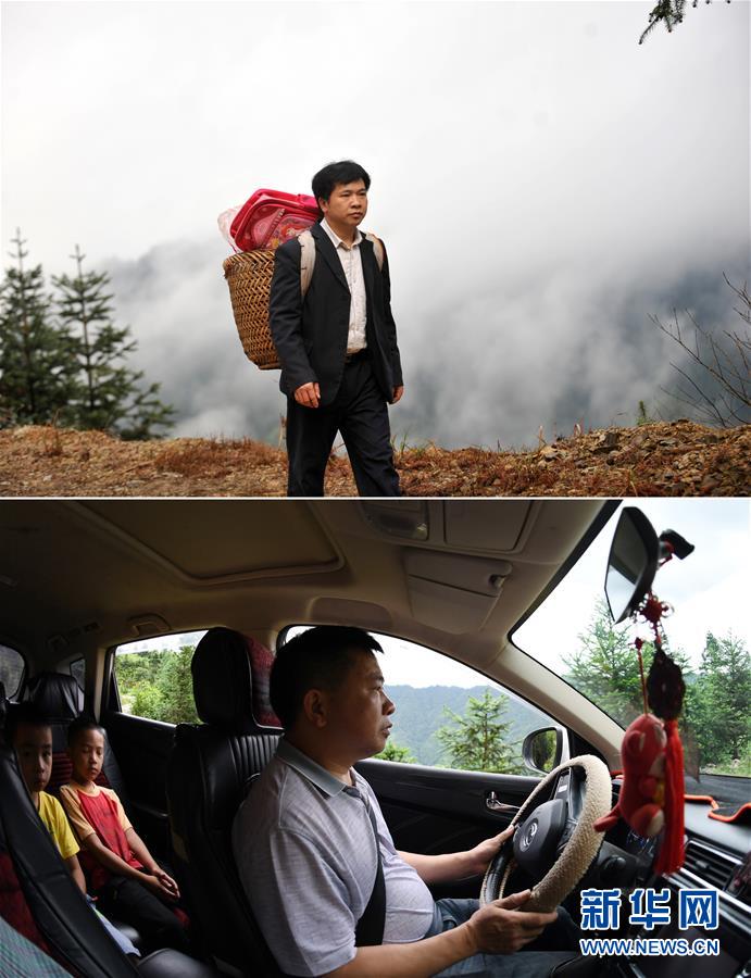这是一张拼版照片,上图:在广西龙胜龙脊镇江柳村,余启贵老师背着背篓走在去学校的路上(2013年2月26日摄);下图:在广西龙胜龙脊镇江柳村,余启贵老师开着自己的汽车带着学生去学校(7月7日摄)。新华社记者陆波岸摄