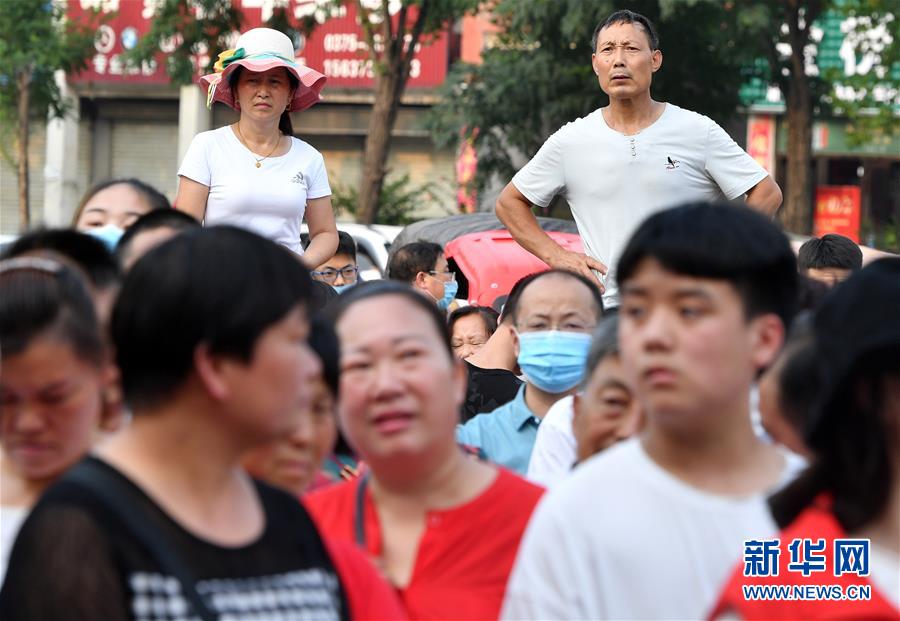 7月8日,在河南省宝丰县第一高级中学考点,家长在考场外等候考生。当日,全国部分地区2020年高考结束。新华社记者李嘉南摄