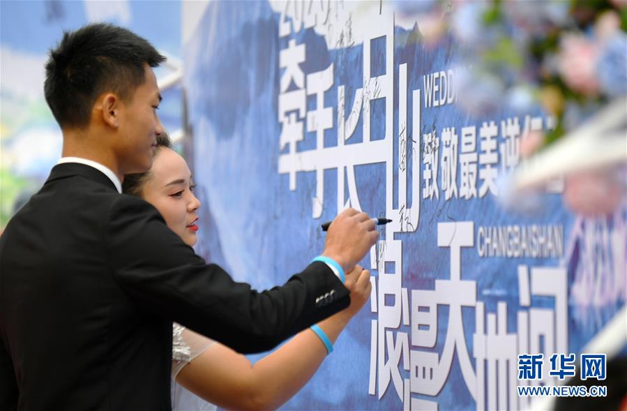 7月8日,一对新人在集体婚礼仪式上签名。新华社记者林宏摄