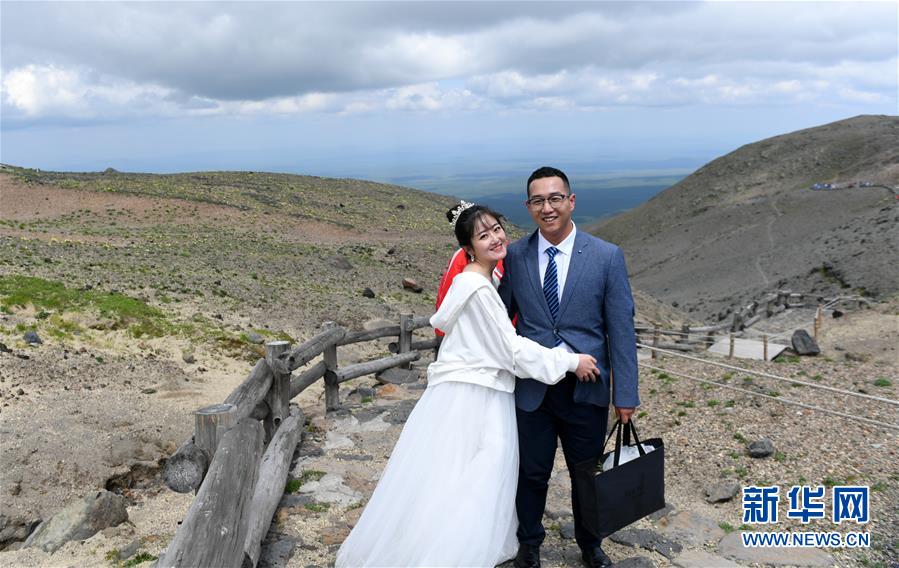 7月8日,一对新人在长白山北景区主峰上拍照。新华社记者林宏摄