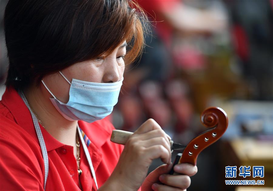 工人在河南驻马店市确山县提琴产业园提琴生产车间打磨琴头(6月23日摄)。新华社记者李嘉南摄